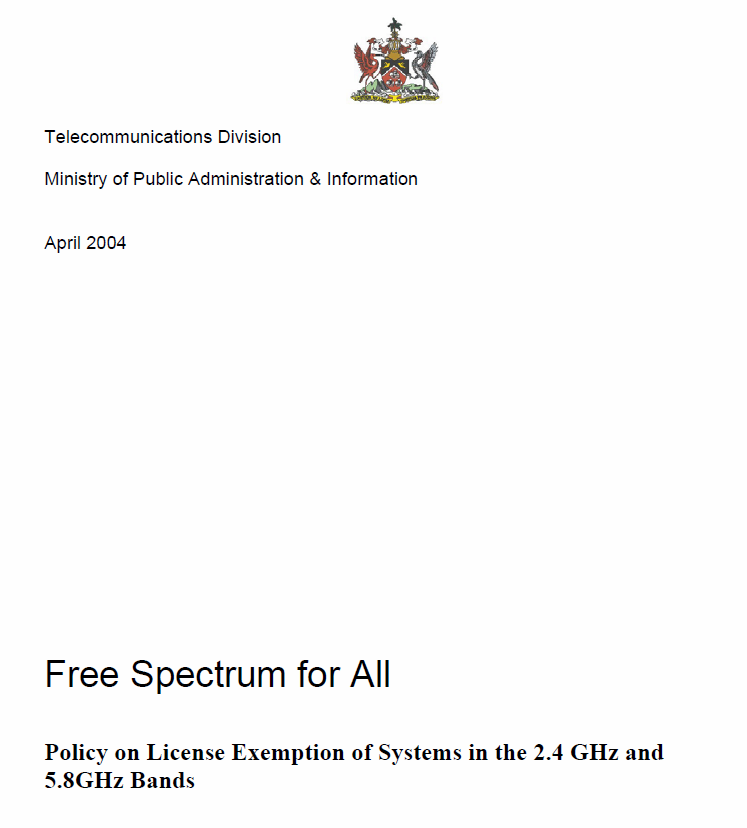 In April 2006, the Telecommmunications Authority of Trinidad and Tobago (TATT) published a Spectrum Plan for Accommodation of Broadband Wireless Access (BWA) Services for comment. “..This plan proposes spectrum bands based on current wireless access technologies and sets out the approach to be adopted by the Authority towards licensing of these bands.”